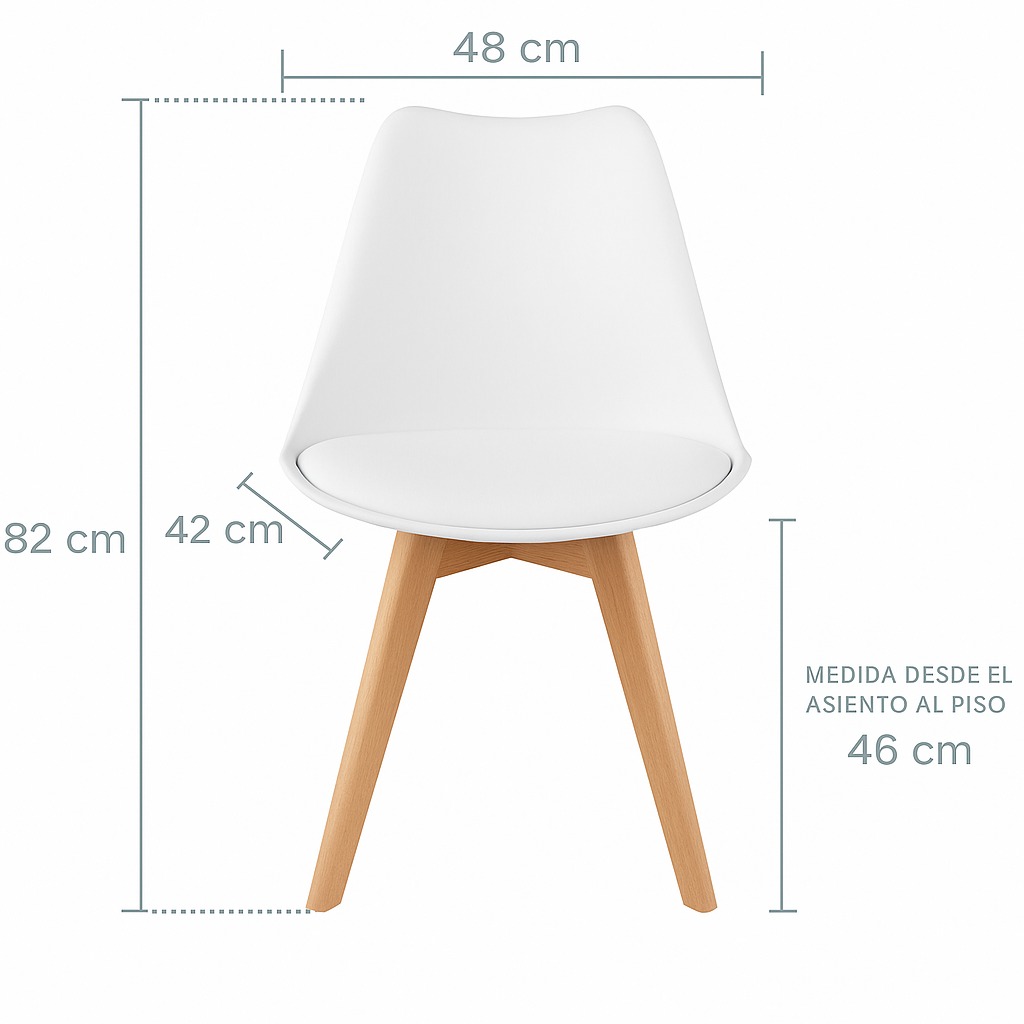 Funda de plástico moldeado de alta calidad con asiento acolchado suave y respaldo de polipropileno para apoyar mejor tu peso y tu espalda, patas de madera duraderas que se mantienen estables y firmes.
